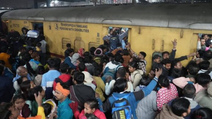 दिल्ली रेलवे स्टेशन से प्रयागराज महाकुंभ आने वाली 2 ट्रेनें लेट हुईं। इस वजह से स्टेशन पर भीड़ ज्यादा हो गई। सफोकेशन से कई महिलाएं बेहोश हो गईं। भीड़ का अंदाजा इस Video से लगाएं… https://t.co/n3dZkPUbT5 pic.twitter.com/N6rQSQbv8L