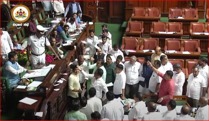 ಇಂದಿನ (ಜು.19) ನಡೆದ ವಿಧಾನಸಭಾ ಅಧಿವೇಶನ ಕಲಾಪದಲ್ಲಿ ಬಿಜೆಪಿ ಸದಸ್ಯರು ಸಚಿವರು ಮಂಡಿಸಿದ ಐದು ವಿಧೇಯಕ ಪ್ರತಿಗಳನ್ನು ಹರಿದು ಸ್ಪೀಕರ್ ಪೀಠಕ್ಕೆ ಎಸೆದ ಘಟನೆ ನಡೆಯಿತು.