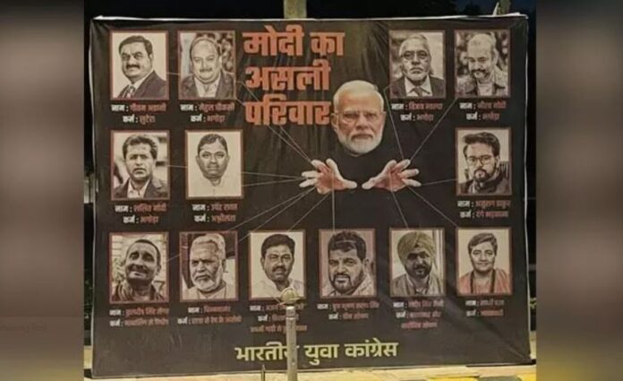 ಈ ವಿವಾದಾತ್ಮಕ ಪೋಸ್ಟರ್ಗಳಲ್ಲಿ ನರೇಂದ್ರ ಮೋದಿ ಮತ್ತು ದೇಶ ತೊರೆದ ಕೆಲವು ಉದ್ಯಮಿಗಳು, ಲೈಂಗಿಕ ದೌರ್ಜನ್ಯದ ಬಿಜೆಪಿ ಮುಖಂಡರೊಂದಿಗೆ “ಮೋದಿ ಕಾ ಅಸ್ಲಿ ಪರಿವಾರ್”(ಮೋದಿಯ ನಿಜವಾದ ಪರಿವಾರ) ಎಂಬ ಶೀರ್ಷಿಕೆಯೊಂದಿಗೆ ಭಾರತೀಯ ಯುವ ಕಾಂಗ್ರೆಸ್ ಎಂದು ಬರೆದಿರುವ ಫ್ಲೆಕ್ಸ್ ಅನ್ನು ಹಲವಡೆ ಹಾಕಲಾಗಿತ್ತು.