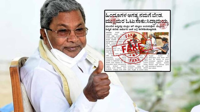 “ಹಿಂದುಗಳ ಅಗತ್ಯ ನಮಗೆ ಬೇಡ. ಮುಸ್ಲಿಮರ ಓಟು ಸಾಕು. ಮುಂದಿನ ಜನ್ಮದಲ್ಲಿ ಮುಸ್ಲಿಂ ಆಗಿ ಹುಟ್ಟಲು ಬಯಸುತ್ತೇನೆ. ಮುಸ್ಲಿಂರ ಓಲೈಕೆ ಕುರಿತು ಬಿಜೆಪಿಗರ ಟೀಕೆ ಬಗ್ಗೆ ತಲೆಕೆಡಿಸಿಕೊಳ್ಳಬೇಡಿ” ಎಂದು ಮುಖ್ಯಮಂತ್ರಿ ಸಿದ್ದರಾಮಯ್ಯ ಹೇಳಿದ್ದಾರೆ ಎಂಬ ರೀತಿಯಲ್ಲಿ ಸುಳ್ಳು ಸುದ್ದಿಯನ್ನು ಚಿತ್ರಿಸಿ, ಬಿತ್ತರಿಸಲಾಗಿತ್ತು. ಈ ಬಗ್ಗೆ ಹರೀಶ್ ನಾಗರಾಜು ಎಂಬವರು ಪೊಲೀಸರಿಗೆ ದೂರು ನೀಡಿದ್ದರು.