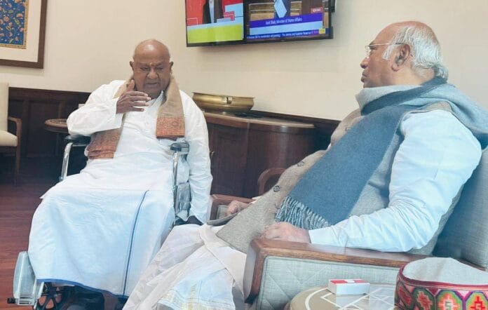 ಸಂಸತ್ ಭವನದಲ್ಲಿರುವ ಮಲ್ಲಿಕಾರ್ಜುನ ಖರ್ಗೆ ಅವರ ಕೊಠಡಿಯಲ್ಲಿ ದೇವೇಗೌಡರು ಖರ್ಗೆ ಅವರನ್ನು ಭೇಟಿ ಮಾಡಿ, ಸುಮಾರು ಹೊತ್ತು ಚರ್ಚೆ ನಡೆಸಿದರು.