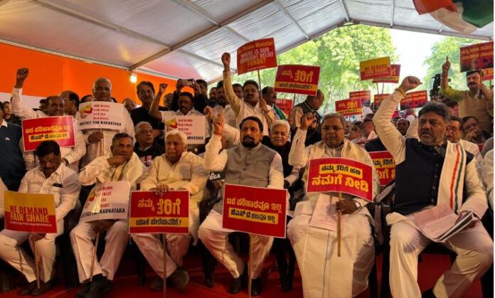 ರಾಜ್ಯಕ್ಕೆ ತೆರಿಗೆ ಹಂಚಿಕೆಯಲ್ಲಿ ಕೇಂದ್ರ ಮಾಡಿರುವ ಅನ್ಯಾಯದ ವಿರುದ್ಧ ಕಾಂಗ್ರೆಸ್ ಸರ್ಕಾರದಿಂದ ದೆಹಲಿಯ ಜಂತರ್ ಮಂತರ್ನಲ್ಲಿ ನಡೆದ ಪ್ರತಿಭಟನೆ