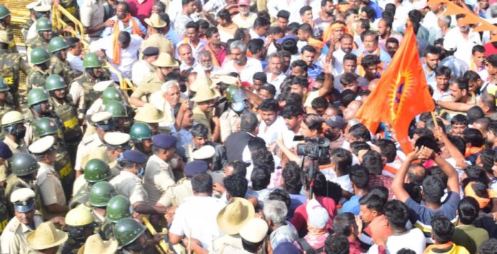 #WATCH | Karnataka: BJP and JDS workers hold protest in Keragodu village, Mandya over the Hanuman flag hoisted by the Gram Panchayat Board of Mandya district, which was brought down by the district administration, yesterday.