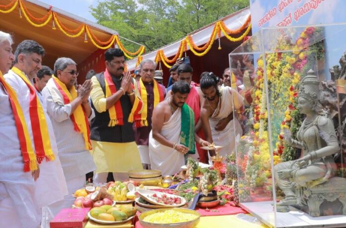 ಇಂದು ಕನ್ನಡ ಮತ್ತು ಸಂಸ್ಕೃತಿ ಇಲಾಖೆ ವತಿಯಿಂದ ಕರ್ನಾಟಕ ನಾಮಕರಣಗೊಂಡ ಸುವರ್ಣ ಮಹೋತ್ಸವ ಅಂಗವಾಗಿ ವಿಧಾನಸೌಧದ ಪಶ್ಚಿಮದ್ವಾರದ ಬಳಿ ಆಯೋಜಿಸಿದ್ದ ಕಾರ್ಯಕ್ರಮದಲ್ಲಿ ಮುಖ್ಯಮಂತ್ರಿ @siddaramaiah ಅವರು ನಾಡದೇವಿ ಭುವನೇಶ್ವರಿ ತಾಯಿಯ ಕಂಚಿನ ಪ್ರತಿಮೆ ನಿರ್ಮಾಣಕ್ಕೆ ಭೂಮಿ ಪೂಜೆ ನೆರವೇರಿಸಿದರು. pic.twitter.com/bAVjycZeWD