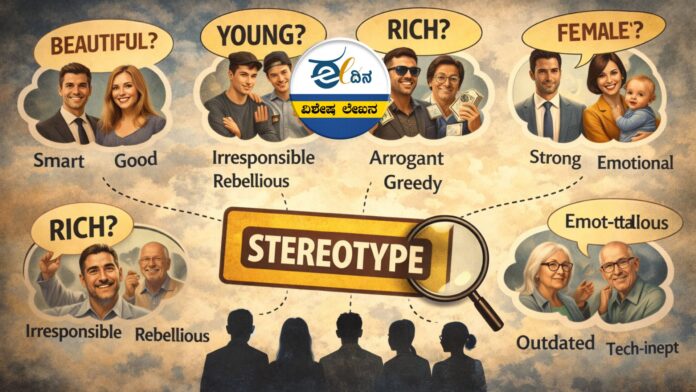 3. ವಯಸ್ಸಿನ ಸ್ಟೀರಿಯೊಟೈಪ್ (Age Stereotype): ವಯಸ್ಸಿನ ಆಧಾರದಲ್ಲಿ ವ್ಯಕ್ತಿಗಳ ಸಾಮರ್ಥ್ಯ ಅಥವಾ ಸ್ವಭಾವ ನಿರ್ಧರಿಸುವುದು. ಉದಾಹರಣೆಗೆ, ಯುವಕರಿಗೆ ಜವಾಬ್ದಾರಿ ಇಲ್ಲ, ಹಿರಿಯರು ತಂತ್ರಜ್ಞಾನಕ್ಕೆ ಅಸಮರ್ಥರು ಇತ್ಯಾದಿ.