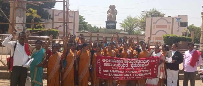 ಅಂಗನವಾಡಿ ಕಾರ್ಯಕರ್ತೆಯರು ಮತ್ತು ಸಹಾಯಕಿಯರ ಗೌರವಧನವನ್ನು ಹೆಚ್ಚಿಸುವಂತೆ ಮುಖ್ಯಮಂತ್ರಿಯವರ ಗಮನಕ್ಕೆ ತರುವಂತೆ ಆಗ್ರಹಿಸಿ ಎಐಟಿಯುಸಿ ನೇತೃತ್ವದಲ್ಲಿ ಅಂಗನವಾಡಿ ಕಾರ್ಯಕರ್ತೆಯರು ಪ್ರತಿಭಟನೆ ನಡೆಸಿದರು.
