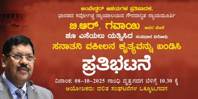 "ಡಾ.ಬಾಬಾ ಸಾಹೇಬ ಅಂಬೇಡ್ಕರ ಅವರ ಅನುಯಾಯಿ ಸುಪ್ರೀಂಕೋರ್ಟ್ ಮುಖ್ಯ ನ್ಯಾಯಮೂರ್ತಿ ಬಿ.ಆರ್.ಗವಾಯಿ ಅವರ ಮೇಲೆ ಕೋರ್ಟ ಹಾಲ್ ನಲ್ಲಿ ಸನಾತನವಾದಿ ವಕೀಲ ರಾಕೇಶ ಕಿಶೋರ್ ಶೂ ಎಸೆದಿರುವುದನ್ನು ಖಂಡಸಿ ಇಂದು ಬೆಳಿಗ್ಗೆ 10:30ಕ್ಕೆ...