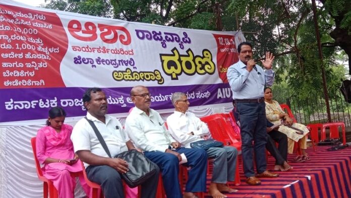 ಆಶಾ ಕಾರ್ಯಕತೆಯರು ತಮ್ಮ ವಿವಿಧ ಬೇಡಿಕೆ ಈಡೇರಿಸುವಂತೆ ಆಗ್ರಹಿಸಿ ಎಐಯುಟಿಯುಸಿಗೆ ಸಂಯೋಜಿತಗೊಂಡ ಕರ್ನಾಟಕ ರಾಜ್ಯ ಸಂಯುಕ್ತ ಆಶಾಕಾರ್ಯಕರ್ತೆಯರ ಸಂಘದ ನೇತೃತ್ವದಲ್ಲಿ ಪ್ರತಿಭಟನೆ ಮಾಡಿದರು.