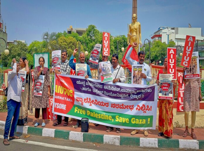 ಎಐಯುಟಿಯುಸಿ ಜಿಲ್ಲಾ ಸಮಿತಿಯಿಂದ ಮೈಸೂರು ನಗರದ ಗಾಂಧಿ ವೃತ್ತದಲ್ಲಿ ಗಾಜಾ ಉಳಿಯಲಿ, ಇಸ್ರೇಲ್ ದಾಳಿ ನಿಲ್ಲಲಿ ಎಂದು ಒತ್ತಾಯಿಸಿ ಪ್ರತಿಭಟನೆ ನಡೆಸಿದರು.
