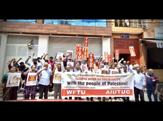 ವಿಶ್ವ ಕಾರ್ಮಿಕ ಸಂಘಗಳ ಒಕ್ಕೂಟ ನೀಡಿದ ಕರೆಯ ಮೇರೆಗೆ, ಪ್ಯಾಲೆಸ್ತೀನಿಯನ್ ಜನರೊಂದಿಗೆ ಜಾಗತಿಕ ಐಕ್ಯತೆಯ ಸಪ್ತಾಹದ ಅಂಗವಾಗಿ ಎಐಯುಟಿಯುಸಿ ಮೈಸೂರು ಜಿಲ್ಲಾ ಸಮಿತಿಯ ನೇತೃತ್ವದಲ್ಲಿ ಪ್ರತಿಭಟನಾ ಪ್ರದರ್ಶನ ಹಮ್ಮಿಕೊಳ್ಳಲಾಯಿತು.