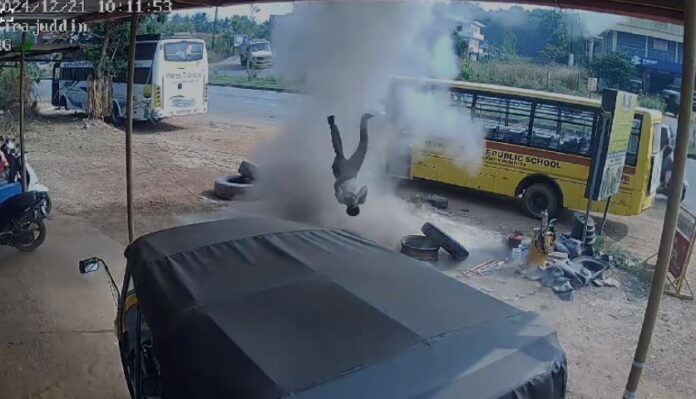 ಪಂಚರ್ ಶಾಪ್ ಒಂದರಲ್ಲಿ ಟೈರಿಗೆ ಗಾಳಿ ತುಂಬುವ ಸಂದರ್ಭ ಟೈರ್ ಸ್ಪೋಟಗೊಂಡು ಯುವಕನೋರ್ವ ಗಂಭೀರ ಗಾಯಗೊಂಡ ಘಟನೆ ಉಡುಪಿ ಜಿಲ್ಲೆಯ ಕುಂದಾಪುರ ಸಮೀಪ ಬಳಿ ನಡೆದಿದೆ.
