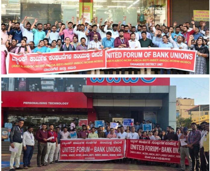 ಐದು ದಿನಗಳ ಬ್ಯಾಂಕಿಂಗ್ ವ್ಯವಸ್ಥೆಗೆ ಒತ್ತಾಯಿಸಿ ದೇಶದಾದ್ಯಂತ ಪ್ರತಿಭಟನೆ ನಡೆಸಲು ಯುಎಫ್ಬಿಯು - ಬ್ಯಾಂಕ್ ಕಾರ್ಮಿಕ ಸಂಘಟನೆಗಳ ಸಂಯುಕ್ತ ವೇದಿಕೆಯು ಕರೆ ನೀಡಿರುವ ಹಿನ್ನಲೆಯಲ್ಲಿ ದಾವಣಗೆರೆಯ ಸಿದ್ದವೀರಪ್ಪ ಬಡಾವಣೆಯ ಕೆನರಾ ಬ್ಯಾಂಕಿನ ಪ್ರಾದೇಶಿಕ...
