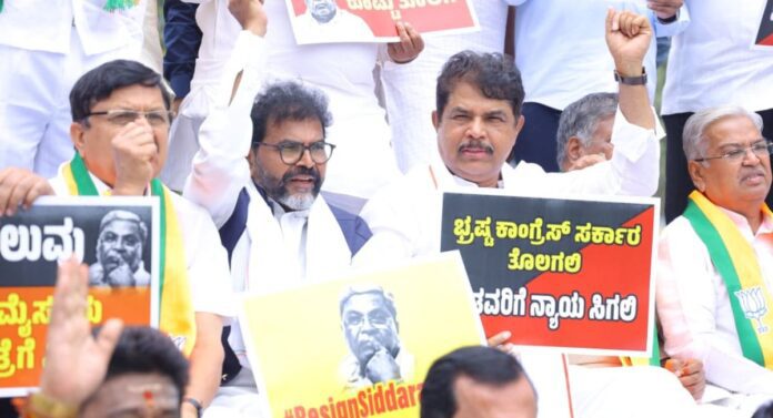 ಸಿಎಂ ಸಿದ್ದರಾಮಯ್ಯ ರಾಜೀನಾಮೆಗೆ ಆಗ್ರಹ, ಗಾಂಧಿ ಪ್ರತಿಮೆ ಮುಂಭಾಗದಲ್ಲಿ ಬಿಜೆಪಿ ಪ್ರತಿಭಟನೆ