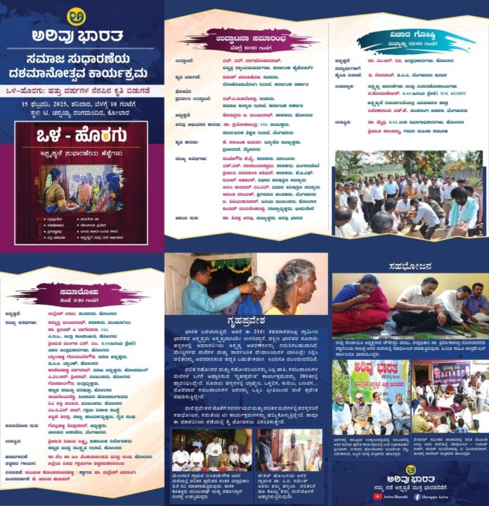 ಕೋಲಾರ ನಗರದ ಟಿ.ಚನ್ನಯ್ಯ ರಂಗಮಂದಿರದಲ್ಲಿ ಫೆ.15ರ ಶನಿವಾರ ಅರಿವು ಭಾರತ ಸಮಾಜ ಸುಧಾರಣೆಯ ದಶಮಾನೋತ್ಸವ ಕಾರ್ಯಕ್ರಮವನ್ನು ಹಮ್ಮಿಕೊಳ್ಳಲಾಗಿದೆ.