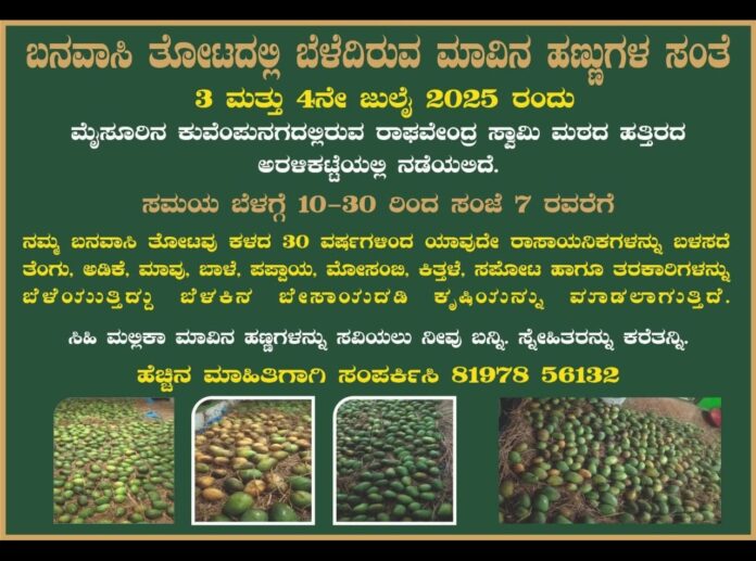 ಮೈಸೂರಿನ ಕುವೆಂಪುನಗರದಲ್ಲಿರುವ ರಾಘವೇಂದ್ರ ಸ್ವಾಮಿ ಮಠದ ಹತ್ತಿರದ ಅರಳಿಕಟ್ಟೆಯಲ್ಲಿ ಬನವಾಸಿ ತೋಟದಲ್ಲಿ ಬೆಳೆದಿರುವ ಮಾವಿನ ಹಣ್ಣುಗಳ ಸಂತೆ ನಡೆಯಲಿದೆ. 2025 ರ ಜುಲೈ 3 ರಿಂದ 4 ರ ವರೆಗೆ ಬೆಳಗ್ಗೆ 10-30 ರಿಂದ...