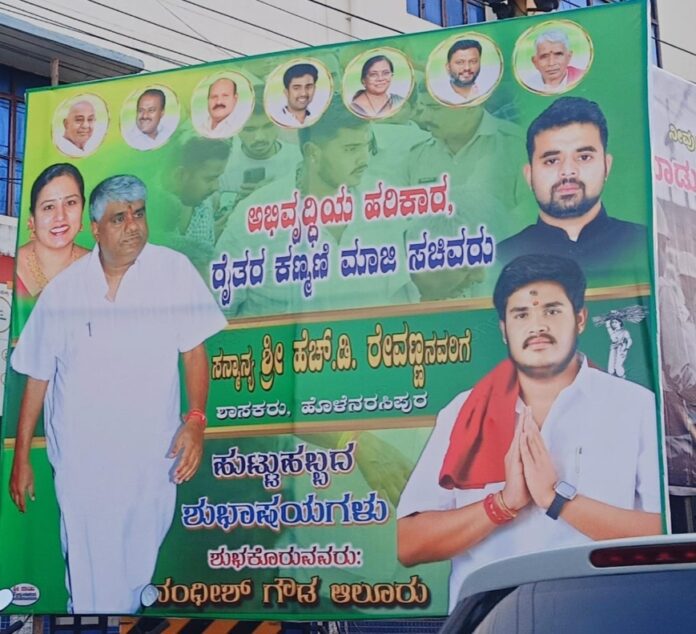 ಹಾಸನ ಜಿಲ್ಲಾಪಂಚಾಯತ್ ಕಚೇರಿಯ ಬಳಿ ಹಾಕಲಾದ ಶಾಸಕ ಎಚ್ ಡಿ ರೇವಣ್ಣ ಅವರ ಜನ್ಮದಿನಕ್ಕೆ ಶುಭ ಕೋರುವ ಫ್ಲೆಕ್ಸ್ನಲ್ಲಿ ಅತ್ಯಾಚಾರದ ಆರೋಪದಲ್ಲಿ ಜೈಲಿನಲ್ಲಿರುವ ಮಾಜಿ ಸಂಸದ ಪ್ರಜ್ವಲ್ ರೇವಣ್ಣನ ಫೋಟೋ ಹಾಕಿರುವುದಕ್ಕೆ ಸ್ಥಳೀಯರು...