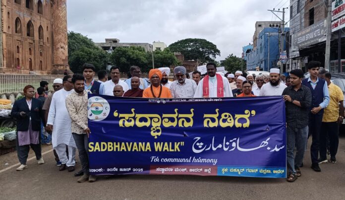 ಸಮಾಜದಲ್ಲಿ ಭಾವೈಕತೆ ಮತ್ತು ಸೌಹಾರ್ದತೆಗಾಗಿ ಬೀದರ್ನಲ್ಲಿ ಸೋಮವಾರ ಏರ್ಪಡಿಸಿದ 'ಸದ್ಭಾವನಾ ನಡಿಗೆ' ಸಾರ್ವಜನಿಕರ ಗಮನ ಸೆಳೆಯಿತು.