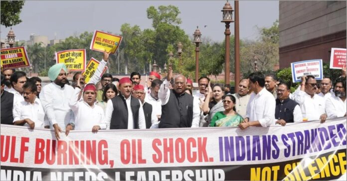 ಪಶ್ಚಿಮ ಏಷ್ಯಾ ಸಂಘರ್ಷ: ಪೂರ್ಣ ಪ್ರಮಾಣದ ಚರ್ಚೆಗೆ ಒತ್ತಾಯ; ಸಂಸತ್ ಆವರಣದಲ್ಲಿ ವಿಪಕ್ಷ ಸಂಸದರ ಪ್ರತಿಭಟನೆ