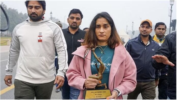 ಏಷ್ಯಾನ್ ಕ್ರೀಡಾಕೂಟ ಹಾಗೂ ಕಾಮನ್ವೆಲ್ತ್ ಕ್ರೀಡಾಕೂಟದ ಚಿನ್ನದ ಪದಕ ವಿಜೇತೆ ವಿನೇಶ್ ಫೋಗಟ್ ಅವರು ತಮ್ಮ ಅರ್ಜುನ ಹಾಗೂ ರಾಜೀವ್ ಗಾಂಧಿ ಖೇಲ್ ರತ್ನ ಪ್ರಶಸ್ತಿಗಳನ್ನು ನವದೆಹಲಿಯ ಕರ್ತವ್ಯ ಪಥ ಮಾರ್ಗದ ಪಾದಚಾರಿ...
