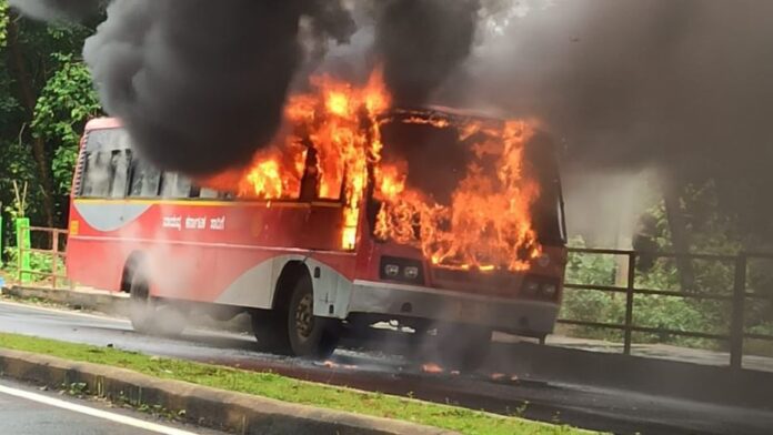 ಶಿವಮೊಗ್ಗ ಜಿಲ್ಲೆಯ ಸಾಗರ ನಗರದ ಕಾಲೇಜೊಂದರ ಬಳಿ ಕೆಎಸ್ಆರ್ಟಿಸಿ ಬಸ್ನಲ್ಲಿ ದಿಢೀರ್ ಬೆಂಕಿ ಕಾಣಿಸಿಕೊಂಡ ಘಟನೆ ನಡೆದಿದೆ.
