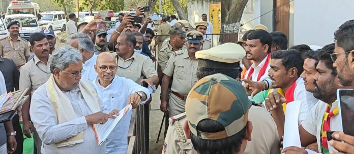 ನೆಟೆ ರೋಗದಿಂದ ಹಾನಿಯಾದ ತೊಗರಿಗೆ ವಿಶೇಷ ಪ್ಯಾಕೇಜ್ ಘೋಷಿಸುವಂತೆ ಆಗ್ರಹಿಸಿ ರೈತ ಮುಖಂಡರು ಭಾನುವಾರ ಕಲಬುರಗಿಯ ಅನ್ನಪೂರ್ಣ ಕ್ರಾಸ್ ಬಳಿ ಸಿಎಂ ಸಿದ್ದರಾಮಯ್ಯ ಅವರ ಕಾರಿಗೆ ಮುತ್ತಿಗೆ ಹಾಕಲು ಯತ್ನಿಸಿದರು.