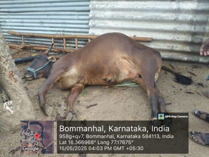 ಸಂಜೆ ಸುರಿದ ಧಾರಾಕಾರ ಮಳೆಗೆ ಸಿಡಿಲು ಬಡಿದು ಎತ್ತು ಸಾವನ್ನಪ್ಪಿರುವ ಘಟನೆ ದೇವದುರ್ಗ ತಾಲೂಕಿನ ಬೊಮ್ಮನಾಳ ಗ್ರಾಮದಲ್ಲಿ ನಡೆದಿದೆ.