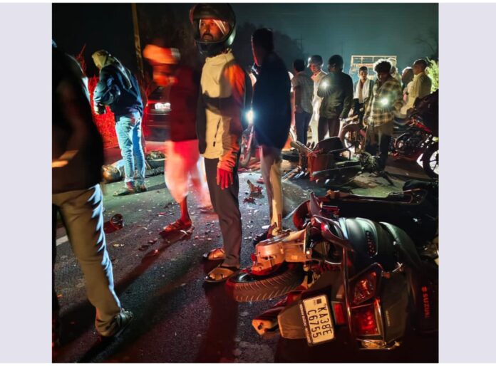 ಬೀದರ್ ತಾಲೂಕಿನ ಬೆನಕನಳ್ಳಿ ಹತ್ತಿರ ಬೀದರ-ವಡಗಾಂವ(ದೇ) ರಸ್ತೆಯಲ್ಲಿ ಶನಿವಾರ ಸಂಜೆ ಎರಡು ಬೈಕ್ ಮಧ್ಯೆ ಮುಖಾಮುಖಿ ಡಿಕ್ಕಿ ಸಂಭವಿಸಿ ಇಬ್ಬರು ಸ್ಥಳದಲ್ಲಿಯೇ ಮೃತಪಟ್ಟು, ಮೂವರು ಗಾಯಗೊಂಡಿದ್ದಾರೆ.