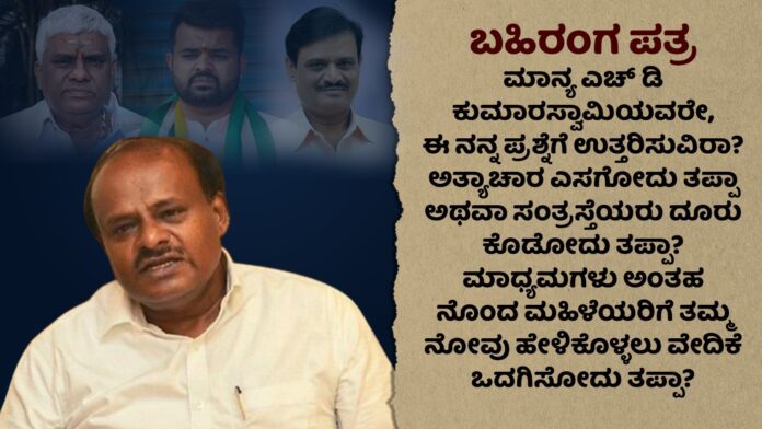 ಮಾನ್ಯ ಮಾಜಿ ಮುಖ್ಯಮಂತ್ರಿ, ಹಾಲಿ ಕೇಂದ್ರ ಸಚಿವ ಎಚ್ ಡಿ ಕುಮಾರಸ್ವಾಮಿ ಅವರೇ, ಶನಿವಾರ(ಸೆ.28) ಜೆಡಿಎಸ್ ರಾಜ್ಯ ಕಚೇರಿ ಜೆ ಪಿ ಭವನದಲ್ಲಿ ನೀವು ನಡೆಸಿದ ಪತ್ರಿಕಾಗೋಷ್ಠಿಯಲ್ಲಿ ಪತ್ರಕರ್ತೆಯಾಗಿ ನಾನೂ ಹಾಜರಿದ್ದೆ. ನೀವು...