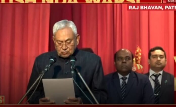 ಆರ್ಜೆಡಿ ಮಹಾಘಟಬಂಧನ್ ಮೈತ್ರಿಕೂಟಕ್ಕೆ ಇಂದು ಬೆಳಿಗ್ಗೆ ಸಿಎಂ ಸ್ಥಾನಕ್ಕೆ ರಾಜೀನಾಮೆ ನೀಡಿದ್ದ ಜೆಡಿಯು ಮುಖ್ಯಸ್ಥ ನಿತೀಶ್ ಕುಮಾರ್ ಎನ್ಡಿಎ ಮೈತ್ರಿಕೂಟದ ಬೆಂಬಲದೊಂದಿಗೆ ಮುಖ್ಯಮಂತ್ರಿಯಾಗಿ ಪ್ರಮಾಣವಚನ ಸ್ವೀಕರಿಸಿದರು.