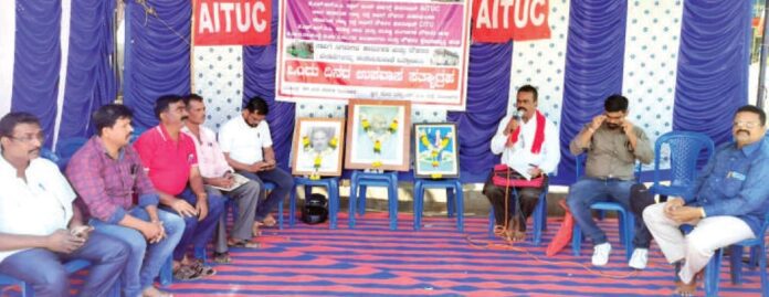 ಕೆಎಸ್ಆರ್ಟಿಸಿ ಸ್ಟಾಫ್ ಅಂಡ್ ವರ್ಕಸ್ ಫೆಡರೇಶನ್ ನೌಕರರ ಮತ್ತು ಕಾರ್ಮಿಕರು ವಿವಿಧ ಬೇಡಿಕೆಗಳ ಈಡೇರಿಕೆಗೆ ಒತ್ತಾಯಿಸಿ ದಾವಣಗೆರೆ ನಗರದಲ್ಲಿ ನೂತನ ಕೆಎಸ್ಆರ್ಟಿಸಿ ಬಸ್ ನಿಲ್ದಾಣದ ಮುಂದೆ ಎಐಟಿಯುಸಿ ಪದಾಧಿಕಾರಿಗಳು ಒಂದು ದಿನದ ಉಪವಾಸ...