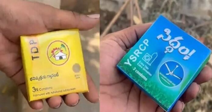 ವೈಎಸ್ಆರ್ ಕಾಂಗ್ರೆಸ್ ಹಾಗೂ ಪ್ರಮುಖ ವಿಪಕ್ಷ ತೆಲುಗು ದೇಶಂ ಪಾರ್ಟಿ(ಟಿಡಿಪಿ)ಯ ನಾಯಕರು ತಮ್ಮ ತಮ್ಮ ಕ್ಷೇತ್ರದ ಜನರಿಗೆ ಉಚಿತವಾಗಿ ಕಾಂಡೋಮ್ ಪ್ಯಾಕೆಟ್ಗಳನ್ನು ಹಂಚಿದ್ದಾರೆ. ಈ ಕಾಂಡೋಮ್ ಪ್ಯಾಕ್ಗಳಲ್ಲಿ ವೈಎಸ್ಆರ್ ಕಾಂಗ್ರೆಸ್ ಹಾಗೂ ಪ್ರಮುಖ ವಿಪಕ್ಷ ತೆಲುಗು ದೇಶಂ ಪಾರ್ಟಿಯ ಹೆಸರು ಚಿಹ್ನೆಗಳನ್ನು ಬಳಸಲಾಗಿದೆ.