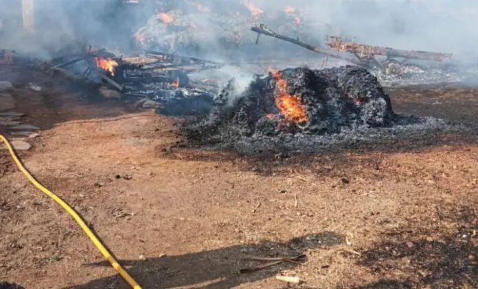 ಆಕಳುಗಳಿಗಾಗಿ ಸಂಗ್ರಹಿಸಿಟ್ಟುಕೊಂಡಿದ್ದ ಮೇವಿನ ಬಣವೆಗಳಿಗೆ ಆಕಸ್ಮಿಕ ಬೆಂಕಿ ತಗುಲಿ ಎಂಟು ಹುಲ್ಲಿನ ಬಣವೆಗಳು ಸುಟ್ಟು ಕರಕಲಾಗಿದ್ದು, ನಾಲ್ಕು ಮನೆಗಳು ಹಾಗೂ ಕೃಷಿಉಪಕರಣಗಳು ಹಾನಿಗೊಳಗಾಗಿರುವ ಘಟನೆ ಹಾವೇರಿ ತಾಲೂಕಿನ ಯಲಗಚ್ಚ ಗ್ರಾಮದಲ್ಲಿ ನಡೆದಿದೆ.