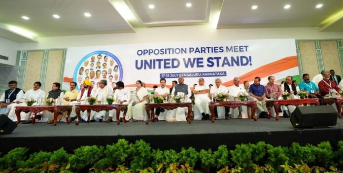 ಬೆಂಗಳೂರಿನ ಖಾಸಗಿ ಹೋಟೆಲ್‌ನಲ್ಲಿ ನಡೆದ ವಿಪಕ್ಷಗಳ ಸಭೆಯ ಬಳಿಕ, ಎಐಸಿಸಿ ಅಧ್ಯಕ್ಷ ಮಲ್ಲಿಕಾರ್ಜುನ ಖರ್ಗೆ ‘ಇಂಡಿಯಾ (I.N.D.I.A)’ ಹೆಸರನ್ನು ಘೋಷಿಸಿದರು.